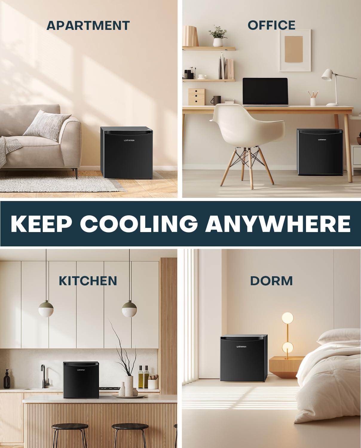 Compact: Given a dimension of 18.9” *17.7” *19.3” (W*D*H), this mini fridge can fit anywhere you need. Whether it’s on the counter or under the desk, it requires little space yet offers plenty of storage room