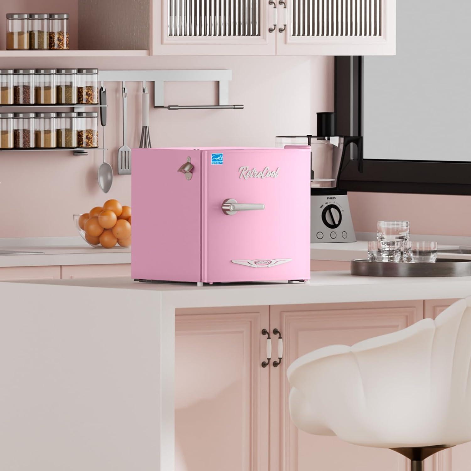 Upstreman 1.7 Cu.Ft Retro Mini Fridge, Low Noise, Energy Saving, Adjustable Thermostat, Single Door, Side Bottle Opener, Metal Handle, Compact Refrigerator for Office, Bedroom, Dorm-FR17 PRO (Pink)(Pink)