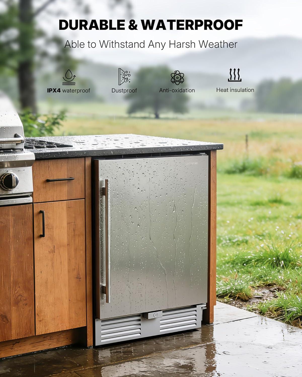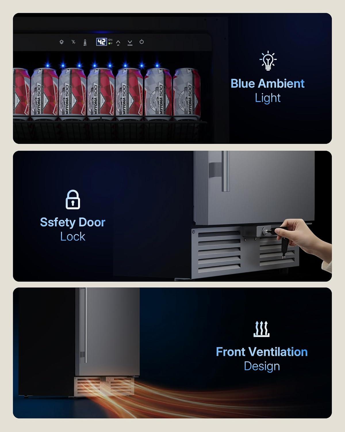 【More Features & Design】The beverage cooler is equipped with soft LED ambient light which helps brighten your beverage in the dark. Child safety door lock to eliminate the risk of accidental touch. Removable gaskets make it easier to clean the outdoor refrigerator. We also provide this counter depth refrigerators with 12 months technical support. During this period, if there is any problem, you can consult our professional service team