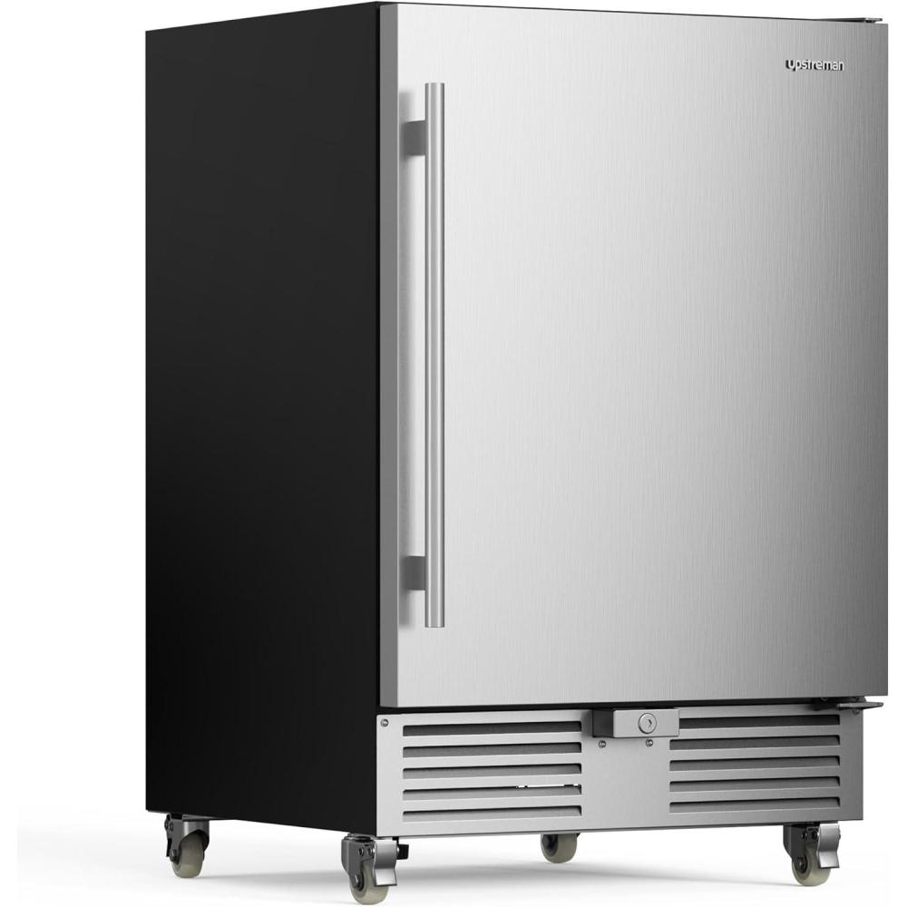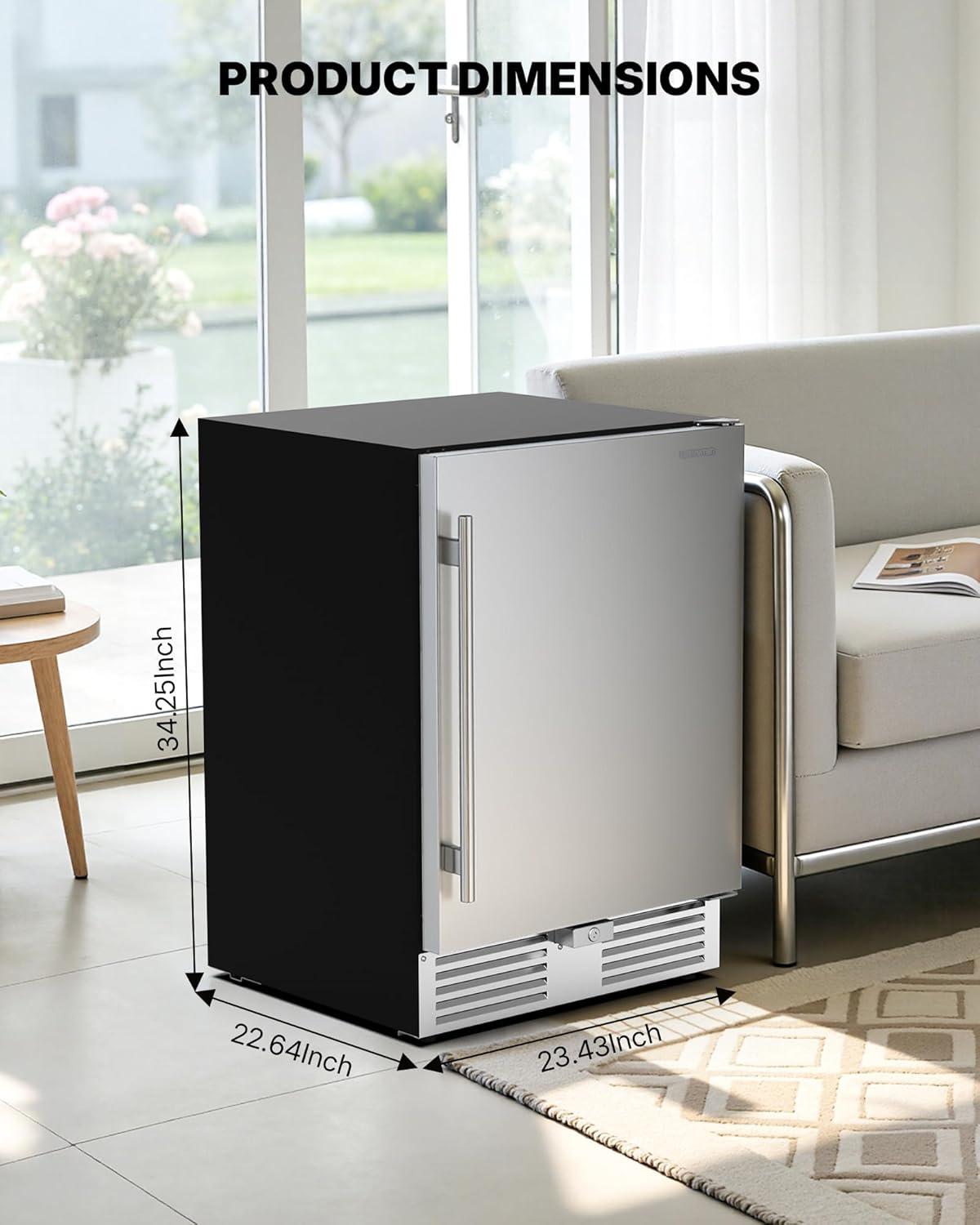 【Built-in Design & Mobility Design】The under counter fridge has a unique front ventilation design, you can install it directly under the counter or freestanding, it will save a lot of space in your home. Product size 22.6″D x 23.4″W x 34.3″H. The refrigerator's wheels with brake allow you to move it with ease. The bottom feet of the refrigerator outdoor fridge adjust the level and height of the beverage refrigerator
