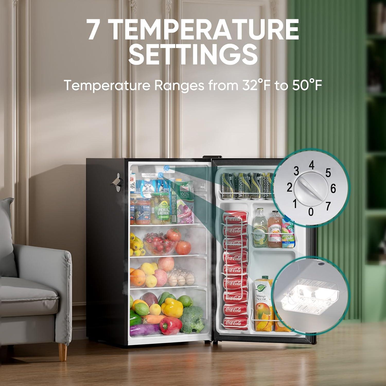 Adjustable Thermostat: From 32°F to 50°F, this small refrigerator offers 7 temperature settings to optimize storage for different products. The hidden evaporator design ensures a stable temperature in the refrigerator, preventing cold air from blowing directly on the food, keeping your food fresh at all time. The smart LED lighting automatically illuminates upon opening, convenient for taking food out at night